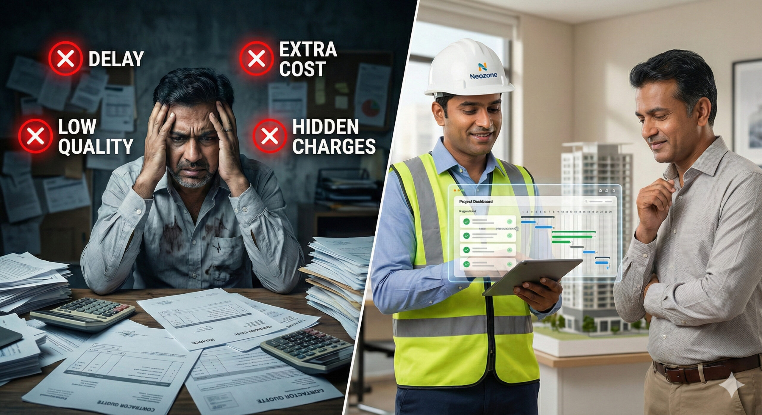 Most homeowners face confusion and stress due to unreliable contractors, rising costs, poor material quality, and project delays. Neozone eliminates these risks with a structured, professional construction system.